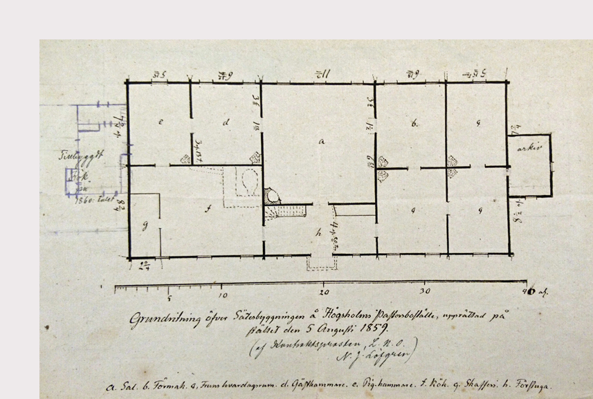 Högsby gamla gamla prästgård Denna prästgård byggdes på 1700-talet, revs då en ny byggdes på samma plats 1909-10. Bilden från 1880-talet. Obs att det är sex personer med på bilden. Längs till vänster står Georg Löfgren. Längs till höger kyrkovaktare Johan Berglund. Kyrkoherde Nils Isak Löfgren 1797-1881 > Ritning av prästgården. Egenhändigt gjord 1859 av kyrkoherde Nils Isak Löfgren > |