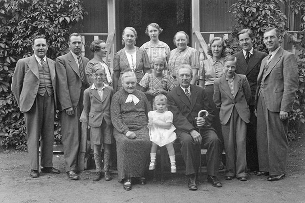 Familjekalas på Hornsberg 1939, Hulda Lindström fyller 75 årStående från vänster: Emil Lindström, Carl Hägerstrand, Berta Hägerstrand f. Lindström, Annie Lindström f. Johansson, Ebba Karlsson f, Lindström, Ellen Lindström, Britta Lindström dotter till Emil, Bengt Lindström son till Emil, Amandus Karlsson. Det äldre paret i mitten är Hulda och Alfred Lindström Pojken till vänster är Birger Kårhag f. Karlsson son till Ebba och Amandus, pojken till höger är Arne Kårhag f. Karlsson son till Ebba och Amandus. Flickan i mitten är Margit Lindström, dotter till Emil. Barnet mellan Hulda och Alfred är Lena Hägerstrand, dotter till Berta och Carl.